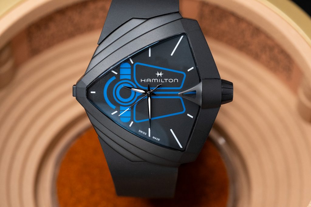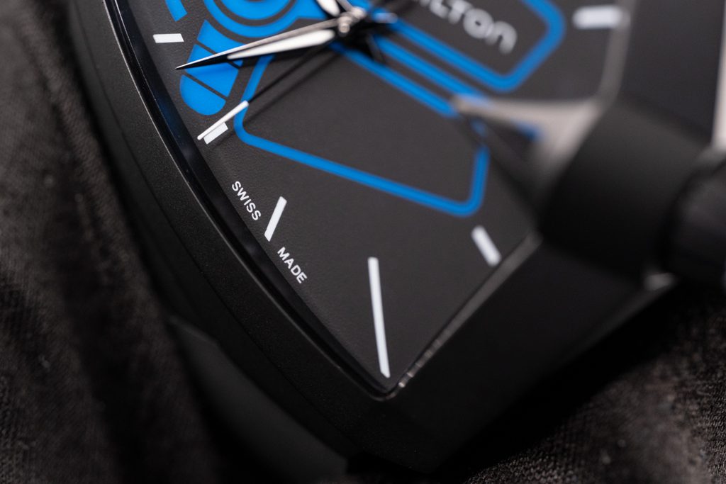 The watch is powered by an ETA F03.105 Swiss quartz movement. The steel shield-shaped case, designed by Richard Arbib for Hamilton in 1957, is the unmistakable and main feature. The blue lines contrast with the deep black dial. What is really most interesting about this model, however, is that when you press the left button, those blue lines light up bright blue for a full 5 seconds.