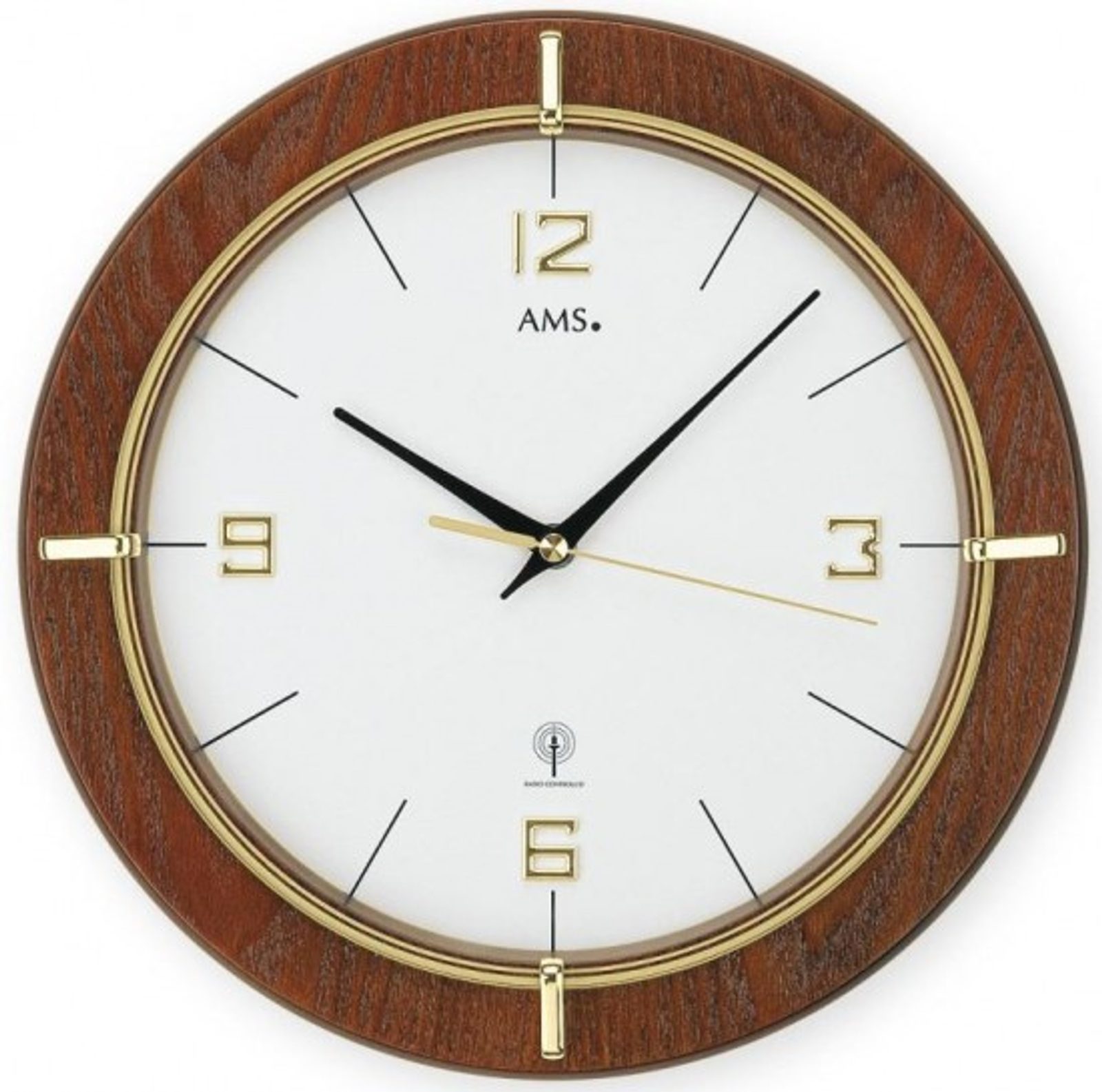 The AMS 5832 clock has a wooden case, complete with a clear dial, and houses a battery-powered movement controlled by a signal from the DCF-77 radio transmitter near Frankfurt. The movement is manufactured by the renowned German brand UTS (Uhrentechnik Schwarzwald), which ensures its highest quality.