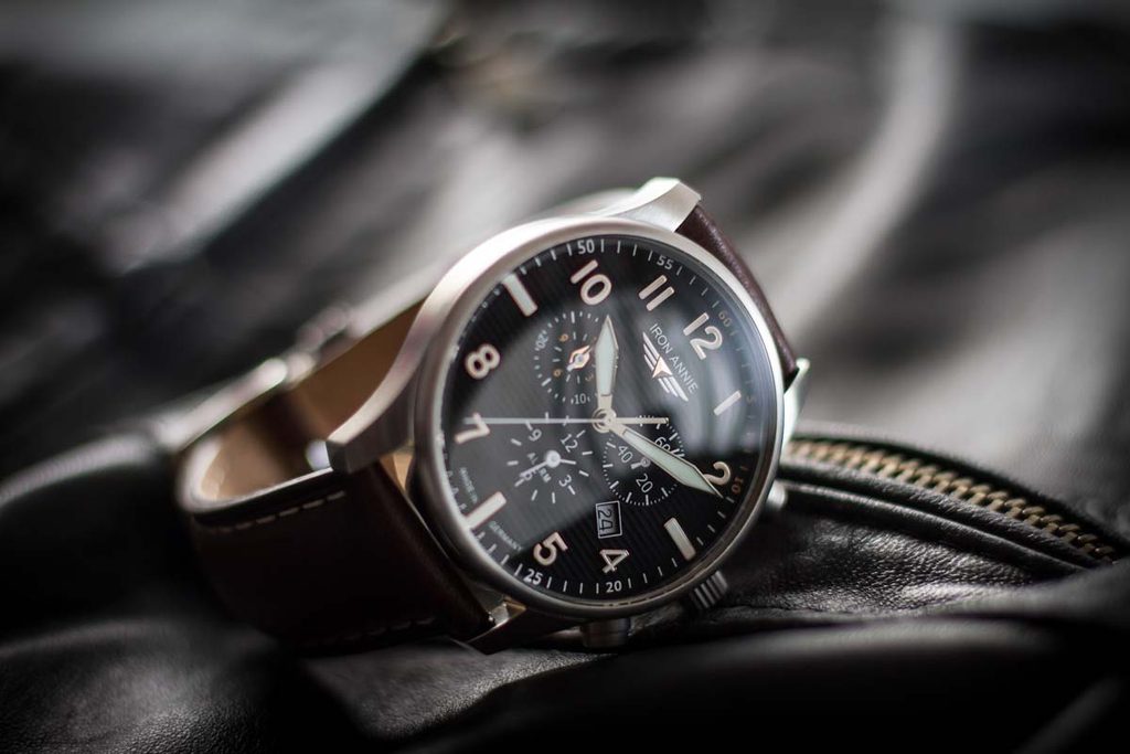 The Iron Annie D-Aqui 5684-2 has a steel case with a distinctive crown, typical of aviation watches, which aids ease of use. The model equipped with stopwatches is powered by a battery-powered Ronda 5130.D movement. The stopwatch, with the ability to measure up to twelve-hour intervals, can be controlled by side buttons - the top button starts and stops the stopwatch, the bottom button resets the measurement. Many will be pleased with the alarm clock function, which has a sub-dial at the 6 o'clock position. There is also a date indicator at the half past four position. The dial in the style of a modern pilot's watch attracts attention with its clarity, so typical of aviation watches. In low-light conditions, you will appreciate the luminescence on the hands and dials. Thanks to the water resistance of 100 m, you don't have to worry about contact with water, hand washing, rain and swimming (we don't recommend taking the leather strap into the water).