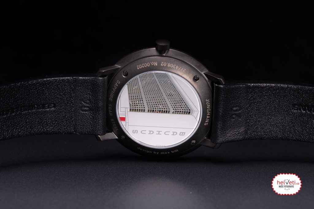 This model was created as a tribute to the Bauhaus art academy in Weimar. It was founded in 1919 by Walter Gropius. On the diadem we find a depiction of the building of this academy, where its red door catches the eye at first glance. The latticed windows of the building feature a very striking view of the J800.1 movement. The red motif is also found on the date display and the hands. Max Bill, who created the now iconic dial design for Junghans, was a famous promoter of the Bauhaus style and a graduate of the Bauhaus art school in Dessau.