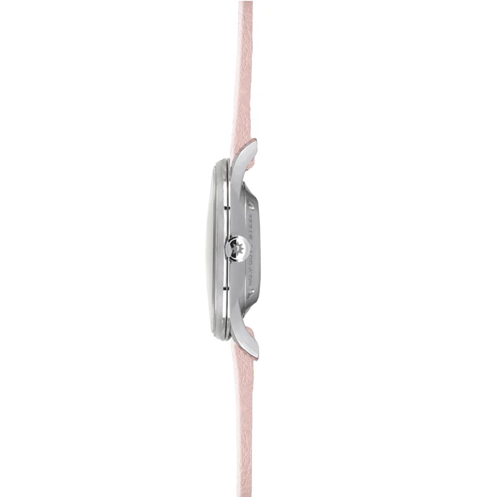 The case with a diameter of 33.1 mm is perfectly adapted for women's wrists. It is held on the wrist by an elegant ostrich leather strap. With a water resistance of 3 ATM (30 meters), it can withstand minor contact with water, which can be likened to washing your hands.