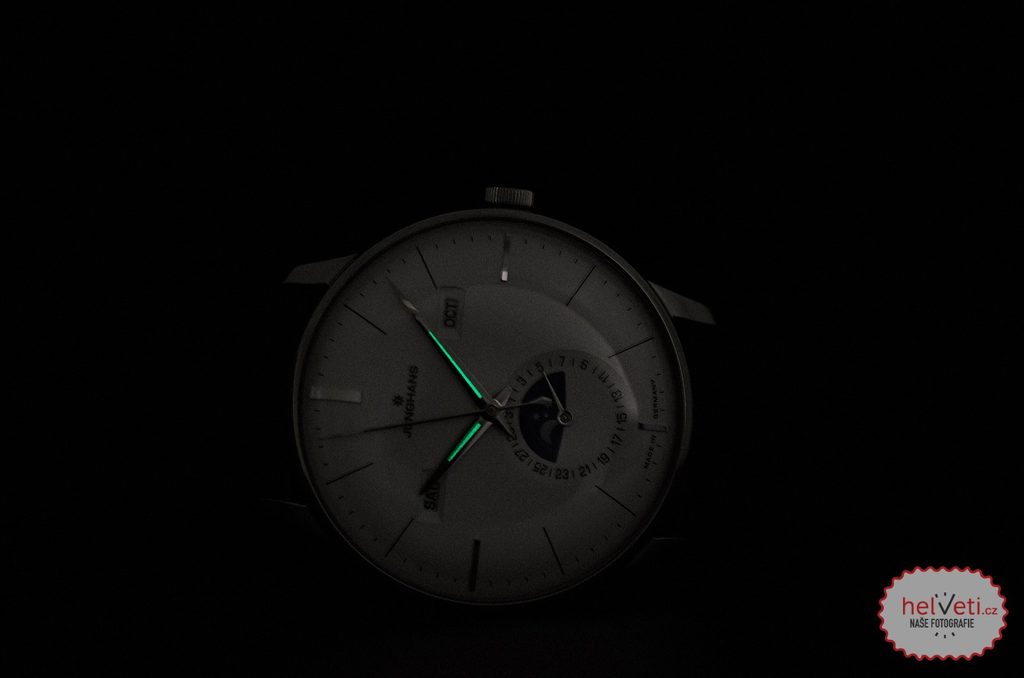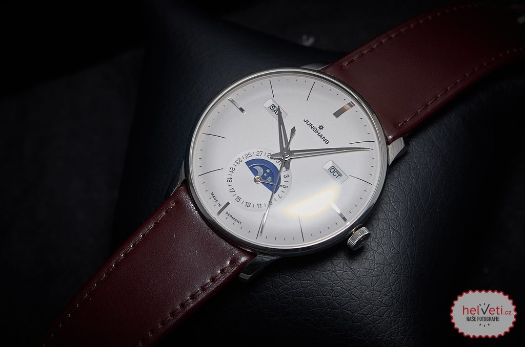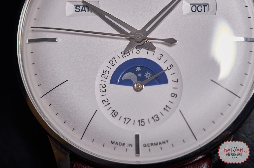 The Junghans Meister Kalender 027/4200.00 is equipped with the J800.3 automatic movement, which is based on the Swiss ETA 2824 variant with the Dubois Depraz 9310 module. The manufacturer incorporates it into the watch in an Elaboré finish with increased shock protection (Incabloc), tuned maximum daily deviation to +/- 14 seconds, or the Junghans logo on the rotor. The power reserve is up to 38 hours. In terms of watchmaking functions, the movement offers a date and moon phase display, which is depicted in the sub-dial at 6 o'clock. At its top, we then find the day of the week and the current calendar month display. Both variants can be set to English or German.