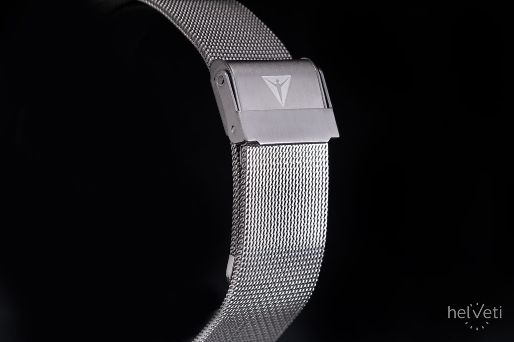 The Junkers 909.01.04.M watch has a stainless steel case with a Japanese Miyota 1L45 battery movement , which features an off-centre seconds hand at 6. The Bauhaus-style dial features minimalist hands that do not detract from the watch's excellent legibility. The watch comes with a sleek steel bracelet that matches the dial design.