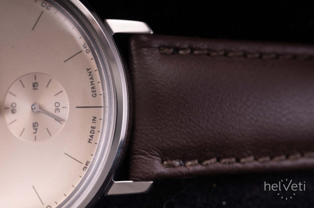 The Junkers 909.01.05 watch has a stainless steel case with a Japanese Miyota 1L45 battery movement , which is characterised by an off-centre seconds hand at 6. The Bauhaus-style dial features minimalist hands that do not detract from the watch's excellent legibility. The watch comes with an elegant leather strap that matches the dial design.