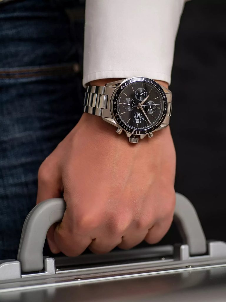 The Junkers 921.01.02.M has a case made of stainless steel, which houses the Swiss mechanical movement ETA Valjoux 7750 with automatic winding and 25 jewels. It operates at a frequency of 28,800 semi-frequencies per hour and features a date and day of the week display at the traditional third hour position. This model is also equipped with a stopwatch function and a tachymeter, which is used to measure the average speed over a precisely defined stretch. The watch comes with a stylish steel bracelet.