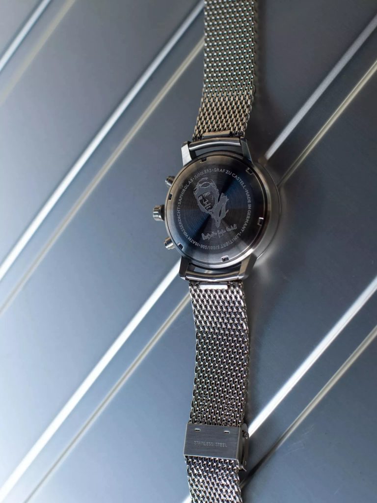 The Junkers Sondereditionen Graf zu Castell 969.01.08.M from the Sondereditionen model series is a watch with an attractive aviation design. The watch is inspired by the captivating adventures of Count zu Castell, a pioneer of German aviation history, whose portrait and signature are engraved on the back of the watch. Only 500 of each colour variant were produced.