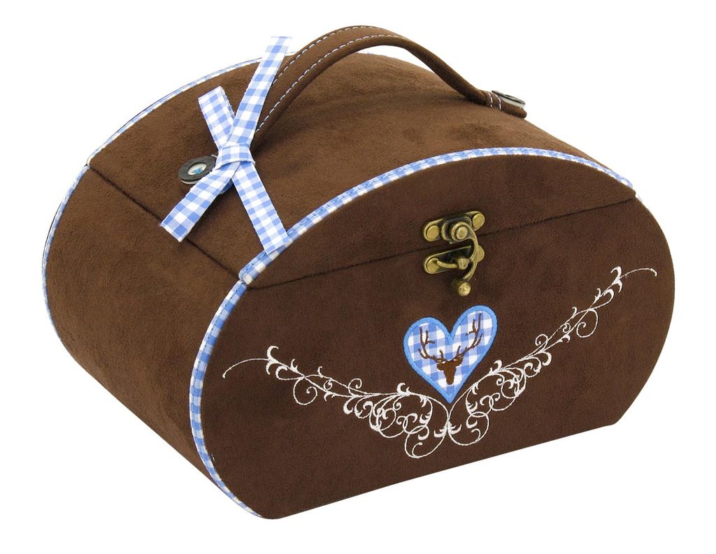 The Friedrich Lederwaren Bavaria 23327-5 brown jewellery box with blue and white interior is made of polyester. The mirror can be found on the inside of the lid.