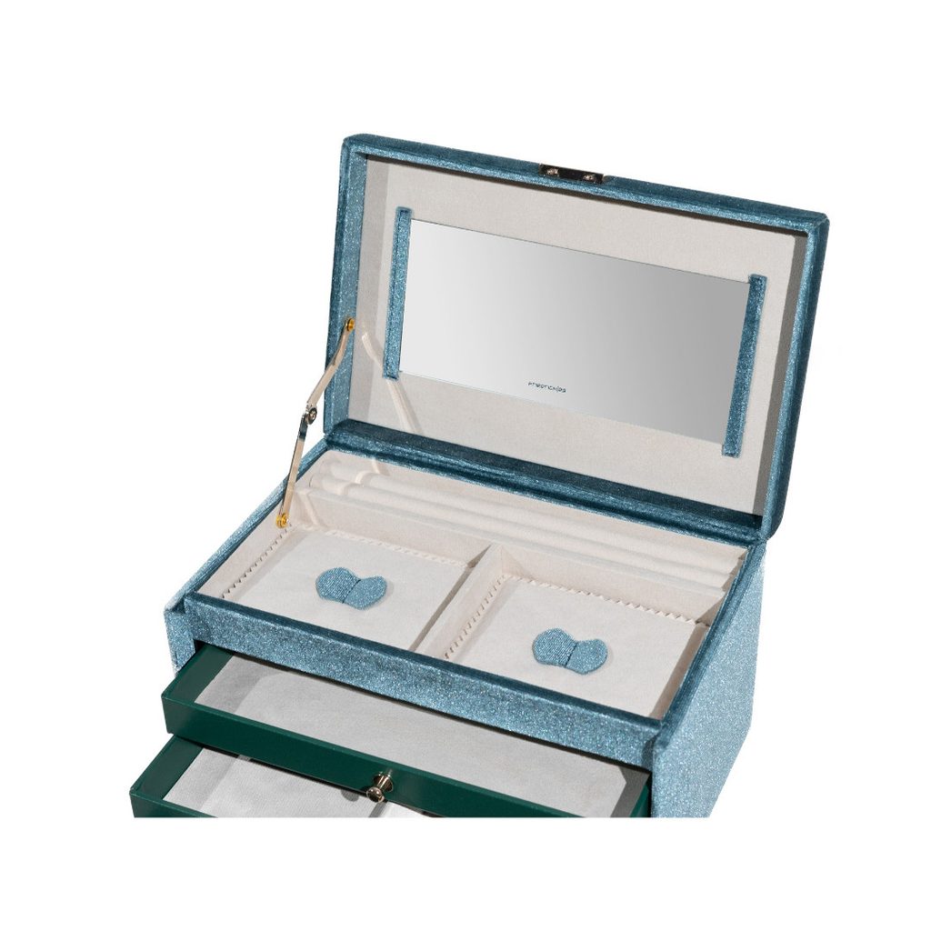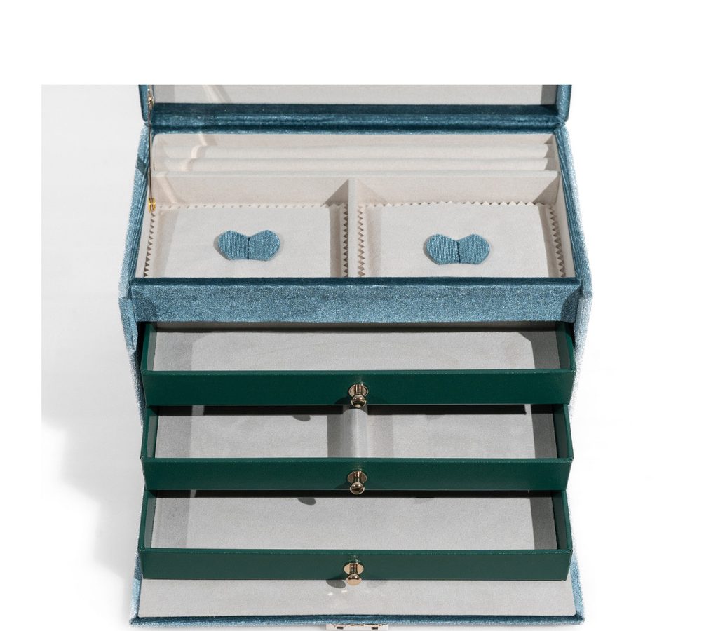 The case has 3 pull-out compartments with different segments for storing jewellery. The mirror is located on the inside of the lid. There is a large storage compartment under the lid for larger jewellery and also separate compartments for storing rings and earrings.