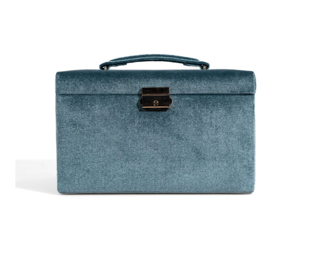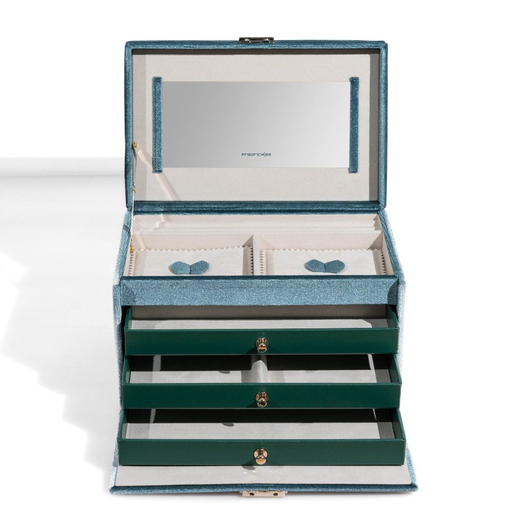 The Friedrich Lederwaren Chenille 23343-5 jewellery box in blue is made of very pleasant chenille material, the interior of the jewellery box is beige.
