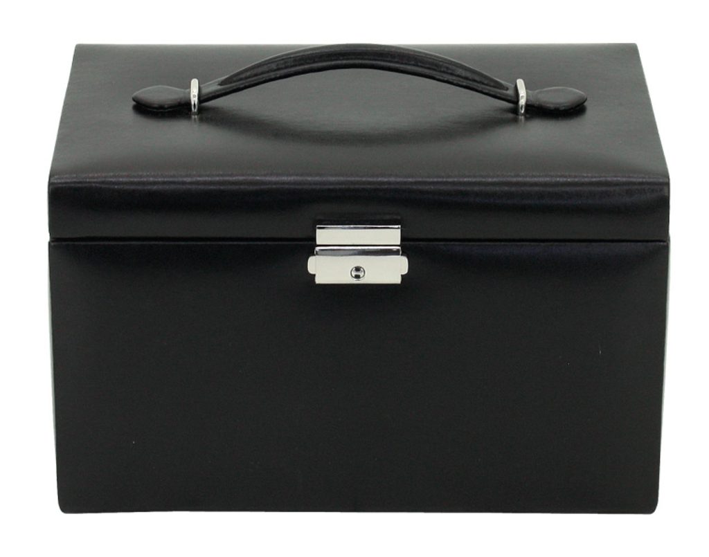 The Friedrich Lederwaren Classico 23231-2 black jewellery box is made of synthetic material. It contains 4 tiers for storing different types of jewellery, a mirror and a strap for placing earrings can be found in the lid of the jewellery box.