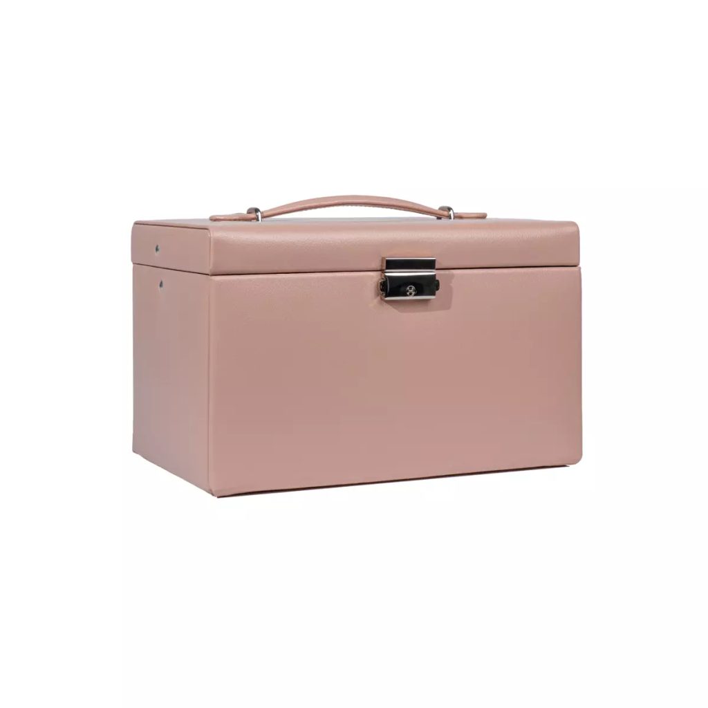 The Friedrich Lederwaren Classico Rosé jewellery box 23238-90 in pink is made of synthetic material. It contains several levels for storing different types of jewellery, a mirror and a strap for placing earrings can be found in the lid of the jewellery box.