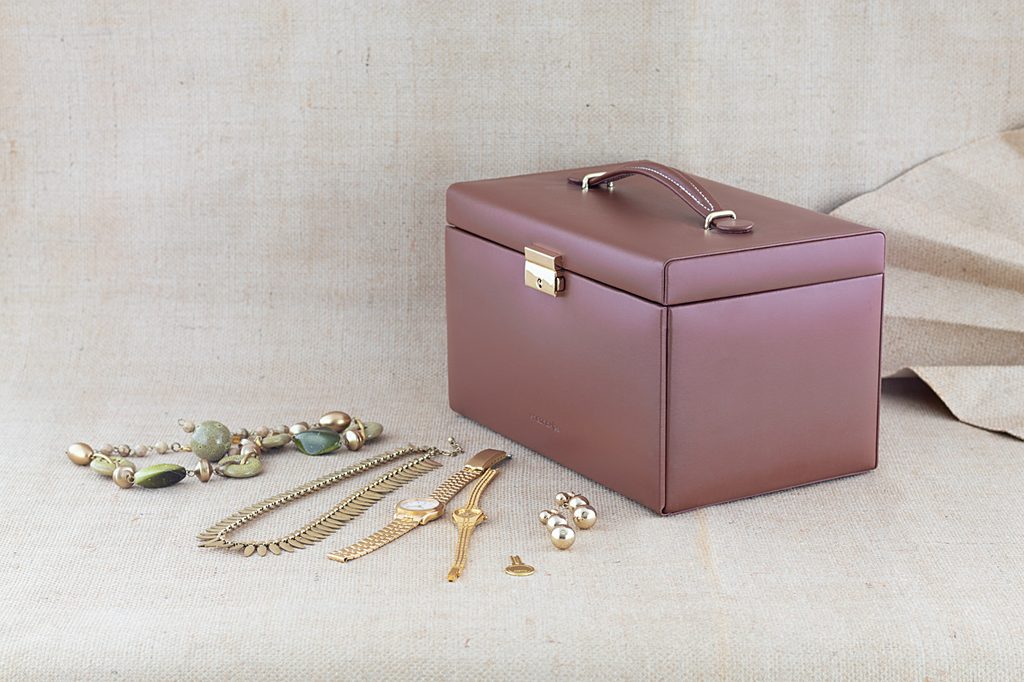The Friedrich Lederwaren Cordoba 26217-3 brown jewellery box is covered with leather, the inner material is velour in beige. It contains 4 tiers for storing different types of jewellery, a mirror in the lid of the jewellery box.