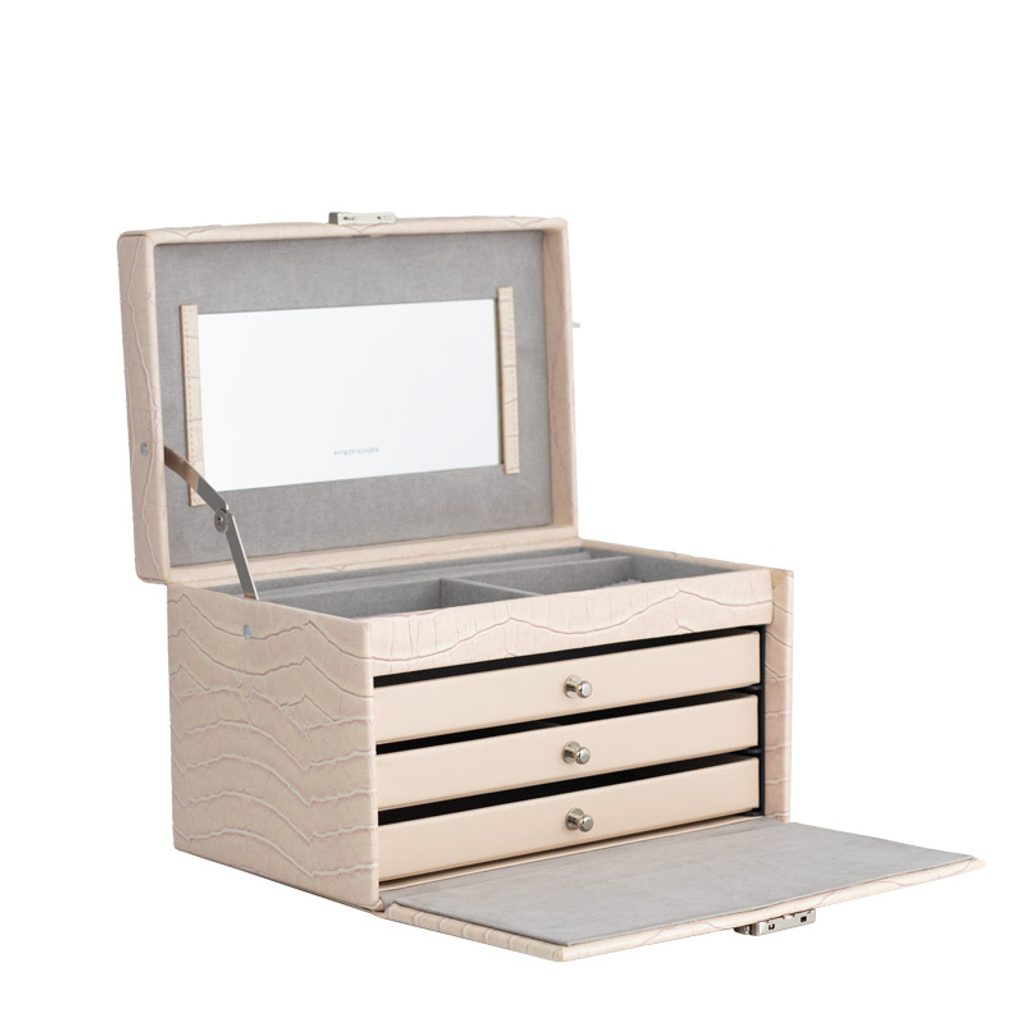It contains 4 tiers for storing different types of jewellery, a mirror can be found on the bottom of the lid. The jewellery box is lockable.