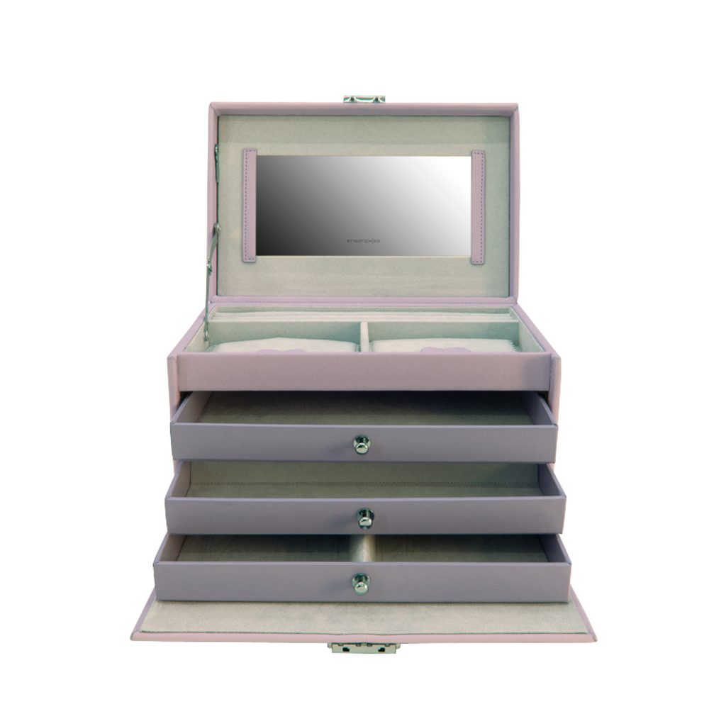 It contains 4 tiers for storing different types of jewellery, a mirror can be found on the underside of the lid. The jewellery box is lockable.