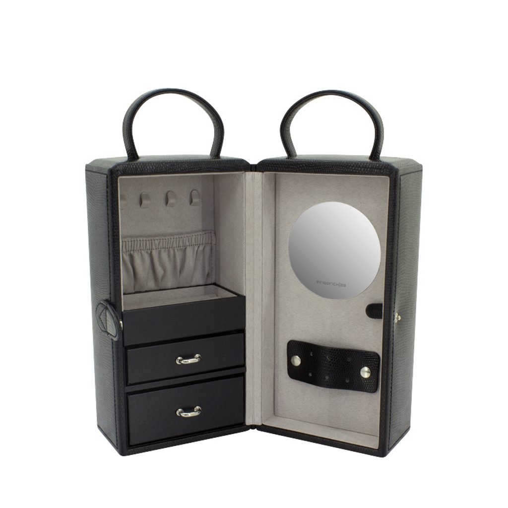 The Friedrich Lederwaren Milano 20141-2 black jewellery box is covered in synthetic leather with a lizard pattern. It contains 3 tiers for storing different types of jewellery, the mirror is on the right side of the jewellery box.