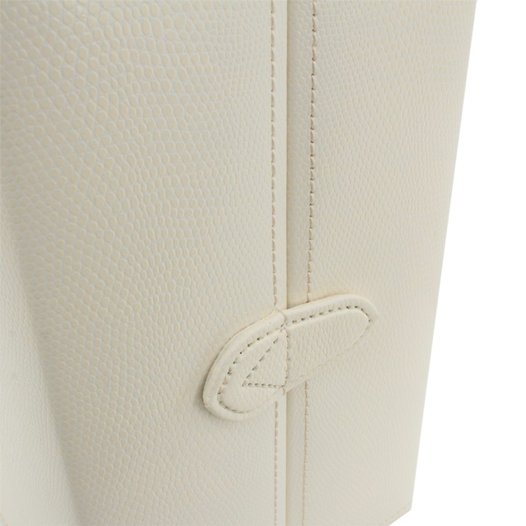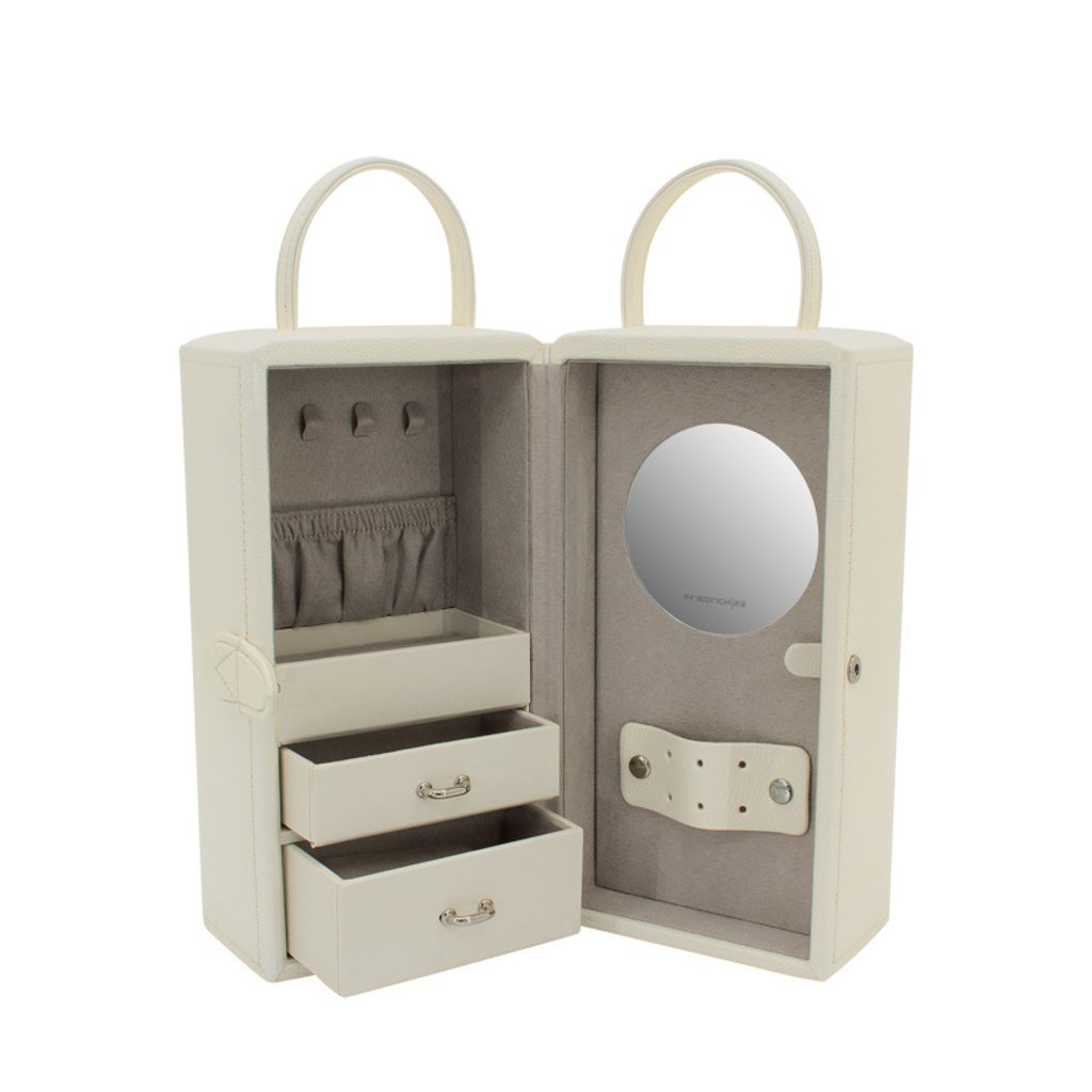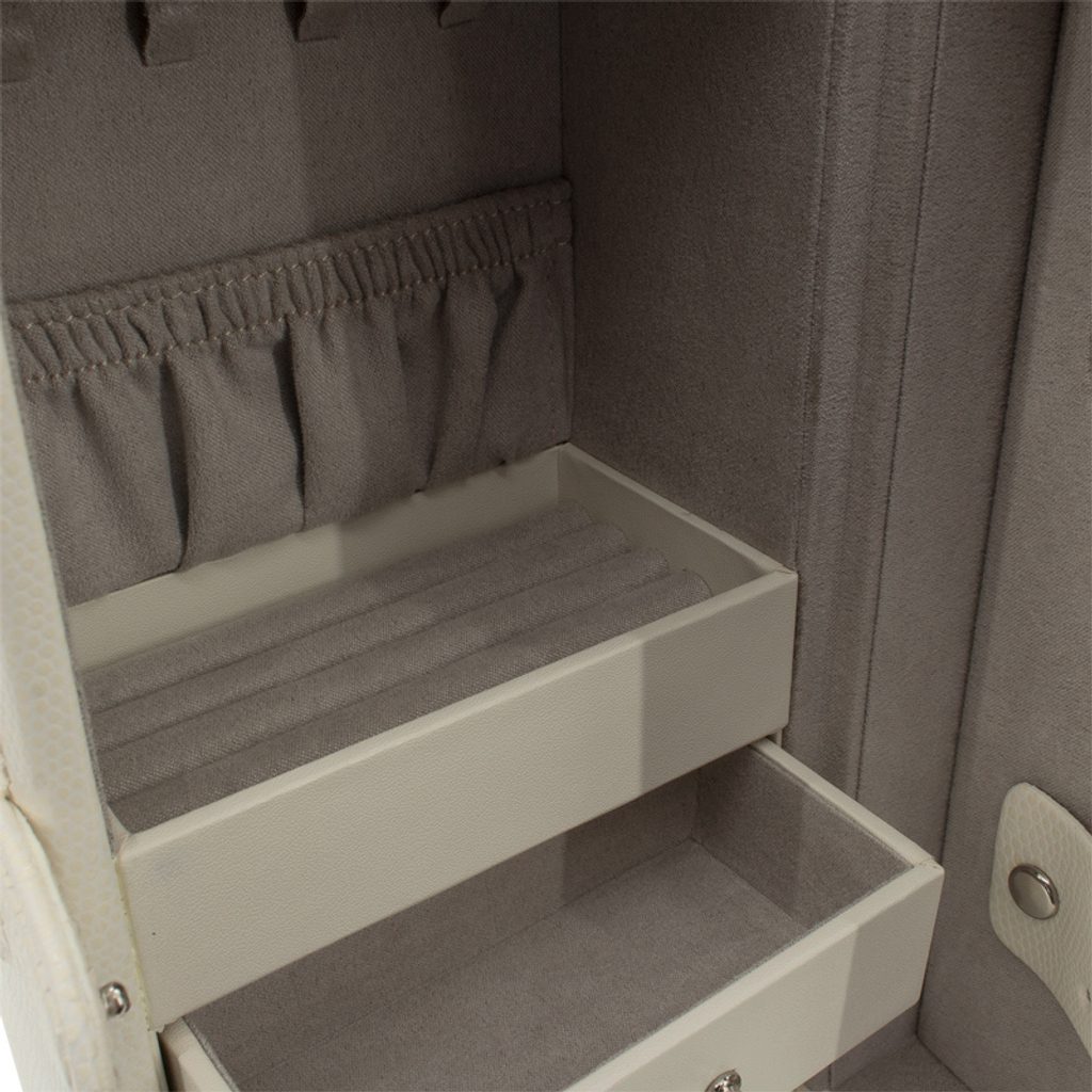 The Friedrich Lederwaren Milano 20141-9 beige jewellery box is covered with synthetic leather. It contains 3 tiers for storing different types of jewellery, the mirror is on the right side of the jewellery box.