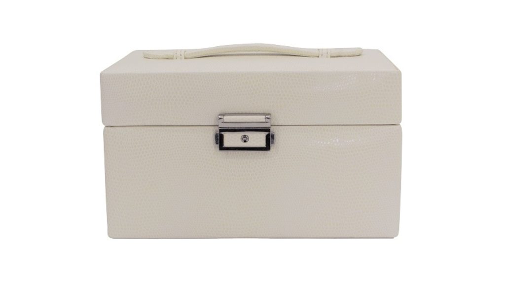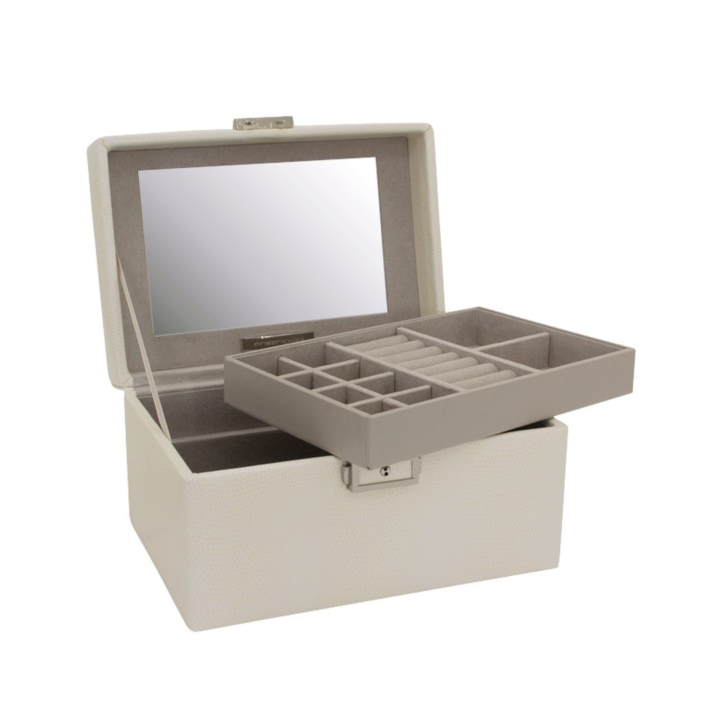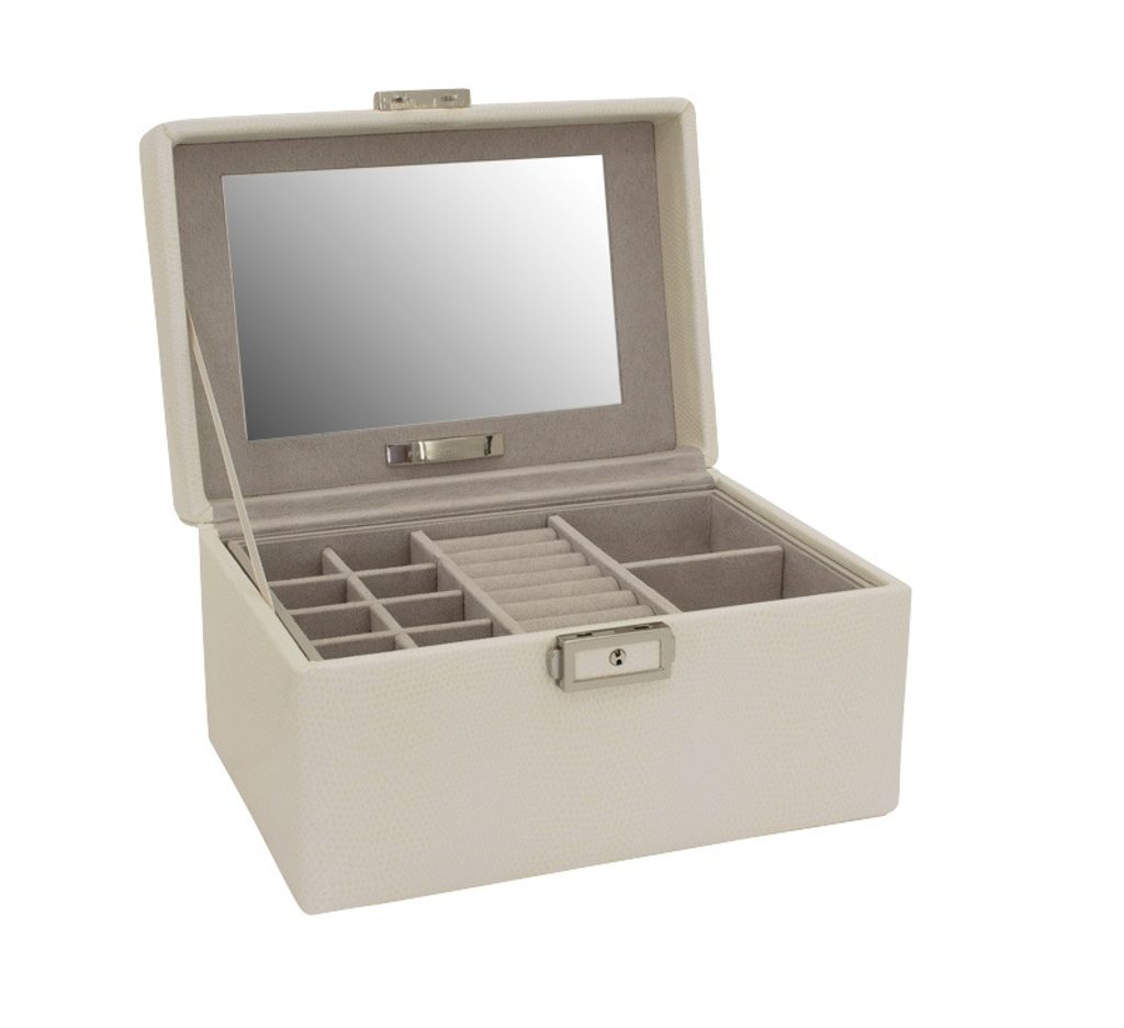 The Friedrich Lederwaren Milano 20142-9 beige perkovnica is covered in synthetic leather with a lizard pattern. It contains 2 tiers for storing different types of jewellery, the mirror is on the inside of the lockable lid.