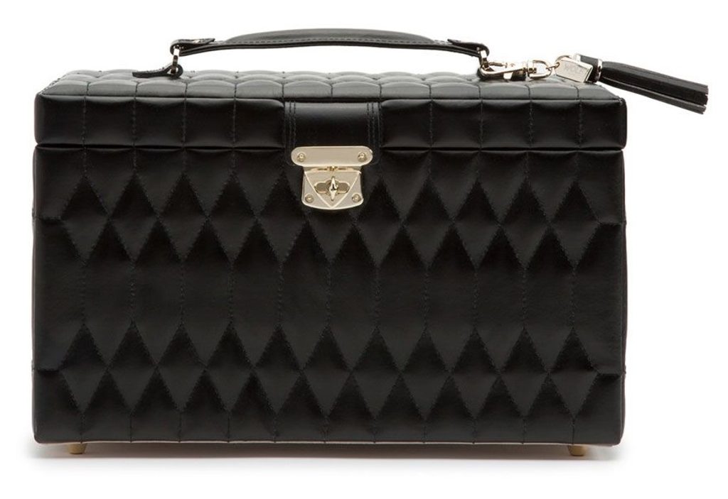 Jewellery box Wolf Caroline Large 329671 black with beige interior. The epitome of sophistication and style. Extra large Caroline jewelry case, a timeless classic with elegant soft 1950s lines, supple quilted leather accented with gold-tone hardware. This refined case is the perfect storage space for your precious jewelry.