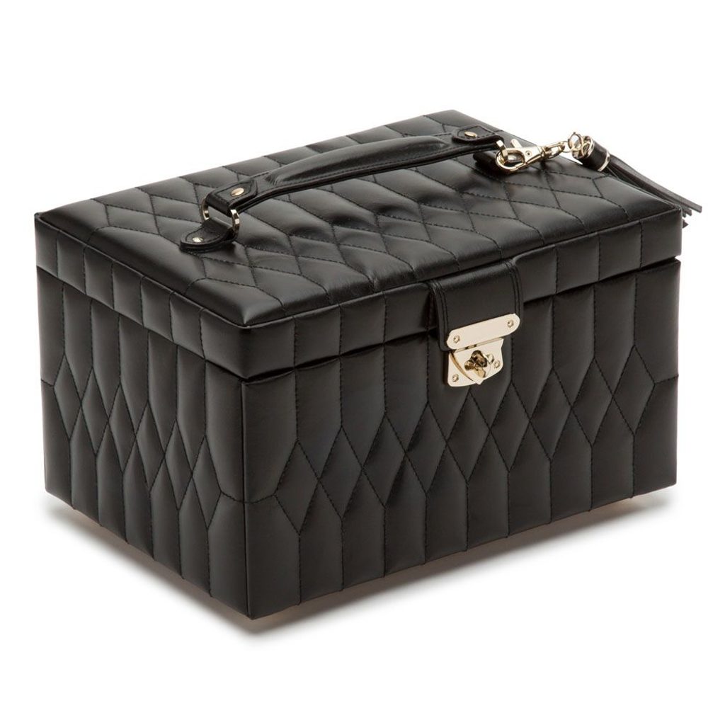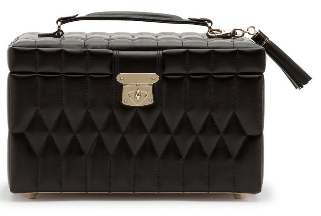 Jewellery box Wolf Caroline Medium 329771 black with beige interior. The epitome of sophistication and style. Extra large Caroline jewelry case, a timeless classic with elegant soft 1950s lines, supple quilted leather accented with gold-tone hardware. This refined case is the perfect storage space for your precious jewelry.
