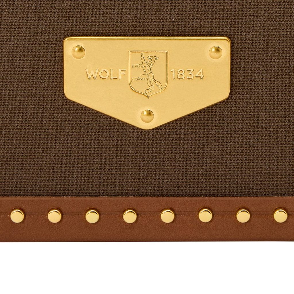 The Wolf Ida 190041 khaki jewellery box with brown interior is made in the style of a suitcase with an outer surface of recycled canvas in luxurious muted tones and padding in premium leather.