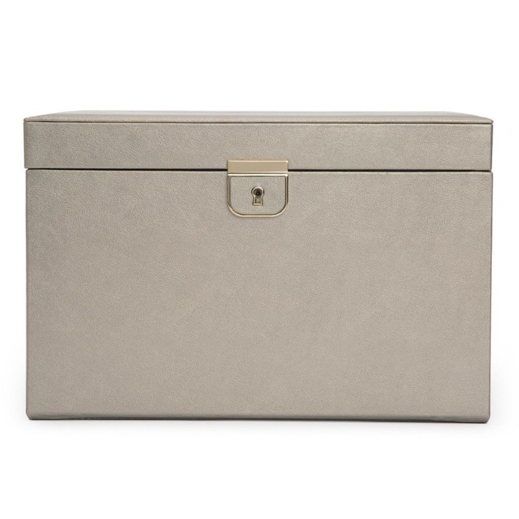 The Wolf Palermo 213078 jewellery box in pewter with grey interior is made of premium leather with gold coloured metal accessories. Glamorous and sophisticated, the Palermo jewellery box is great for displaying and storing your jewellery in style.