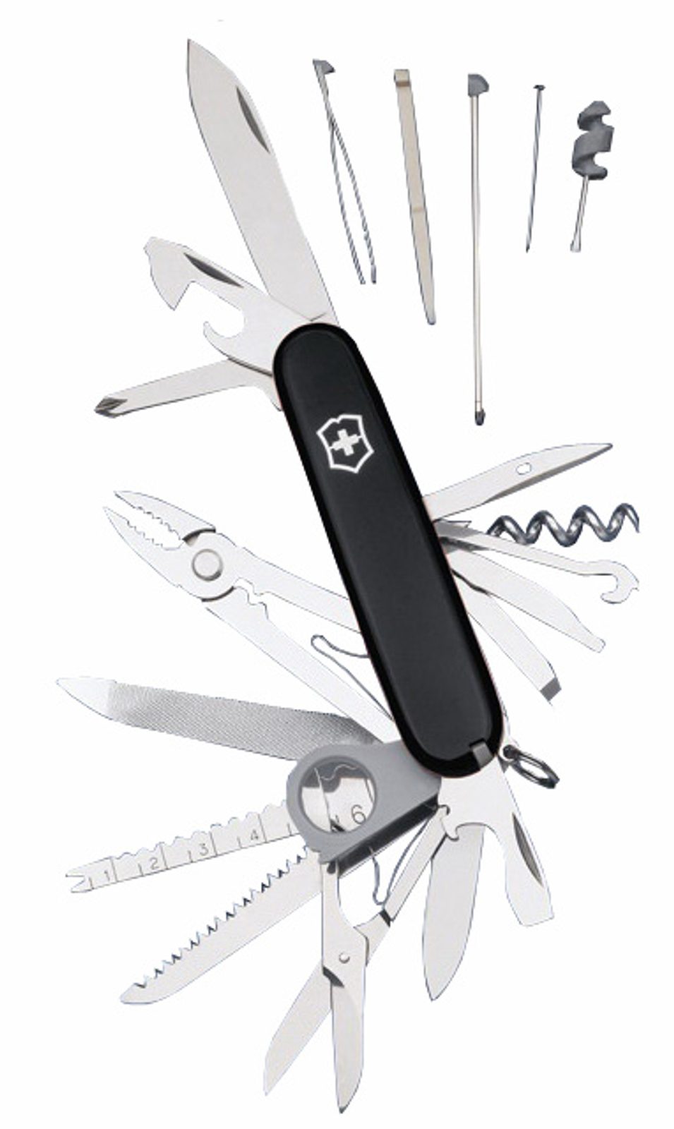 The 91 mm Swiss Champ pocket knife is equipped with 33 functional tools: