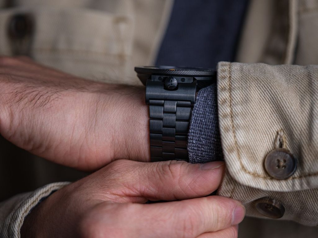 The Laco Atacama Quarz UTC MB from the Squad series features an unusual construction with a screw-down crown located at the 12 o'clock position. This position does not hinder ease of use and ensures that despite the larger case size, the watch is comfortable on the wrist. The steel case of the watch with a black PVD finish is complemented by a link steel bracelet with a black DLC finish. The watch is equipped with a unidirectional rotating countdown lunette, which was chosen for the possibility of easy time synchronization. The black dial features excellent clarity and legibility, which is enhanced in low-light conditions by luminescence on the hands, numerals and indices. It is protected by a sapphire crystal. With a case size of 46 mm, the watch sits well on the wrist thanks to the sophisticated shape of the conical case. Thanks to the battery-powered movement, the height of the watch has been reduced to just 10.5 mm. The water resistance of the model is 200 m (20 ATM) and its set of features makes it predestined for use in sports and in the water.