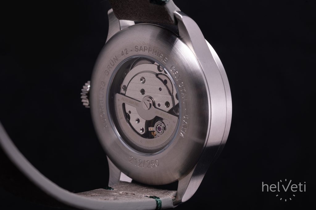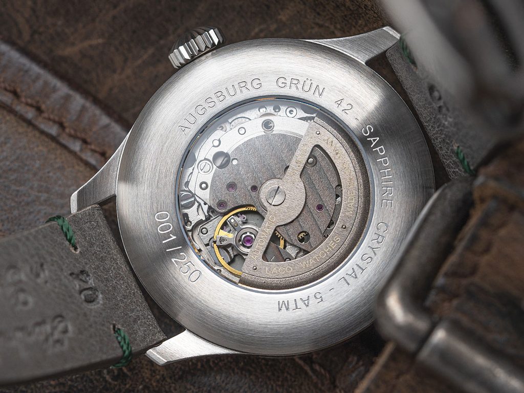 The steel case of the Laco Flieger Augsburg Grün 42 is complemented by a grey leather strap with stitching in the colour of the dial. It is powered by a mechanical movement with Laco 2S automatic winding (Miyota 82S0 base), offering a power reserve of around 42 hours, a stop-seconds function when setting the time (hacking) and manual winding. Many will be pleased to be able to observe the movement through a open caseback with a sapphire crystal. The water resistance of this watch is 50 m (5 ATM). The diameter of the case is 42 mm, the length (lug-to-lug) is 50 mm, so the watch fits well on most men's wrists.