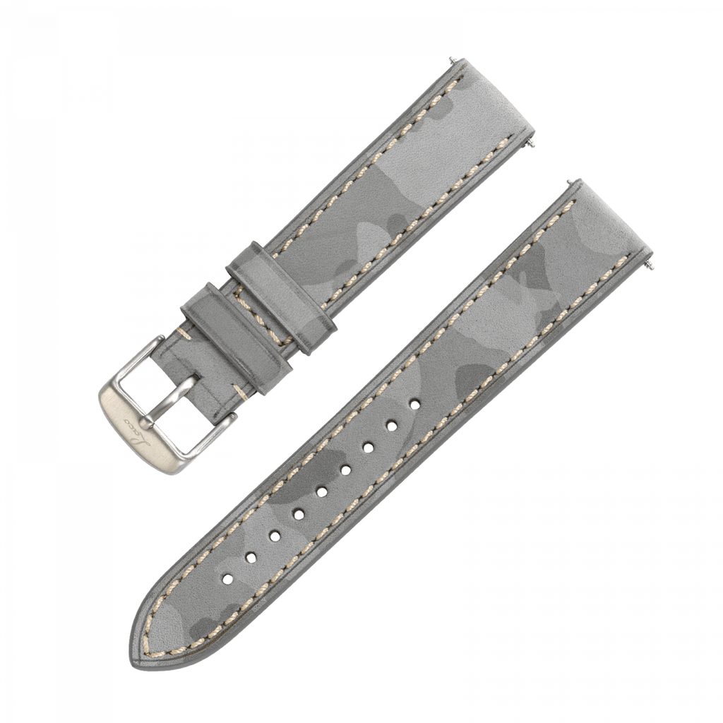 This grey strap with a camouflage pattern is made of high-quality leather and its perimeter is decorated with light stitching. It perfectly underlines the character of pilot and sports watches, especially Laco Blaue Stunde models. The pin buckle is engraved with the Laco logo.