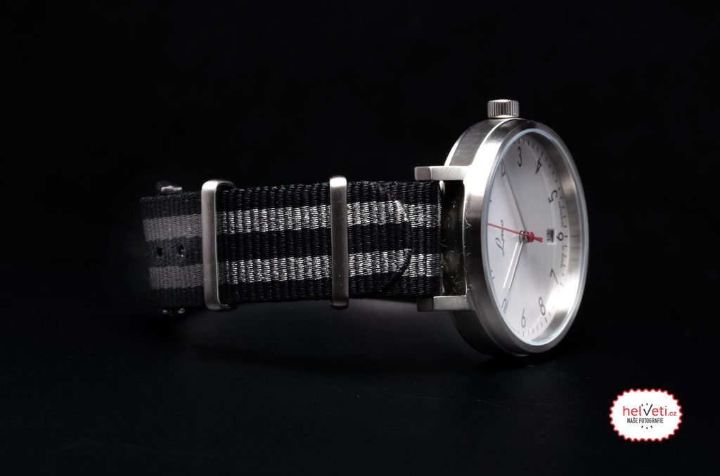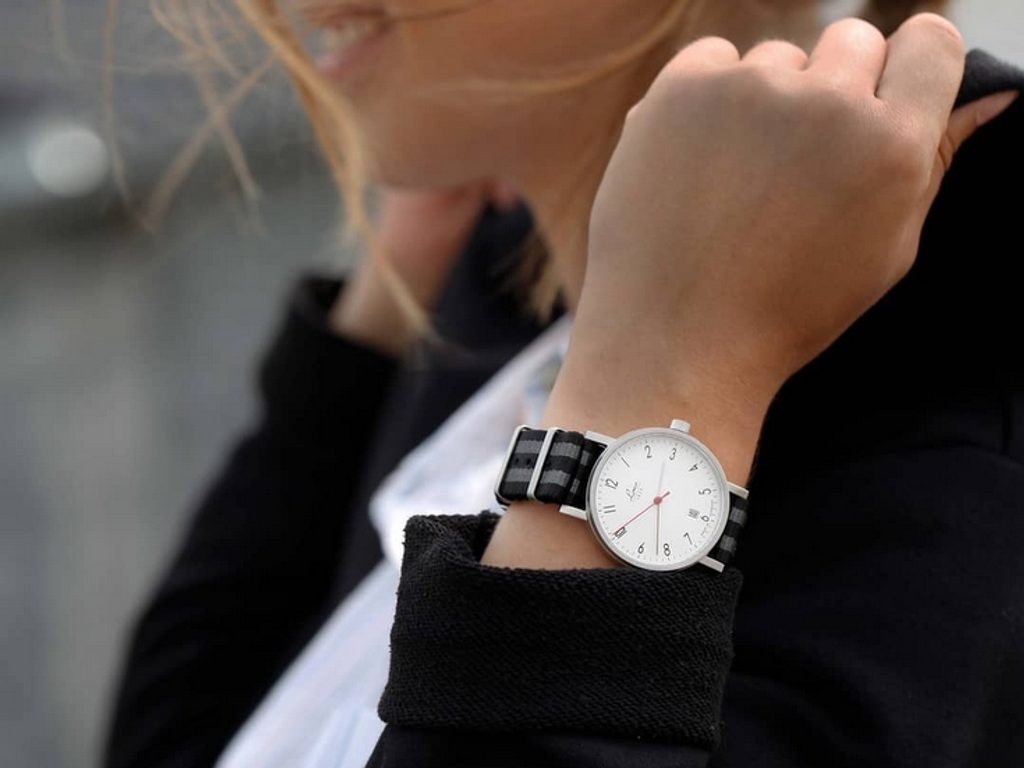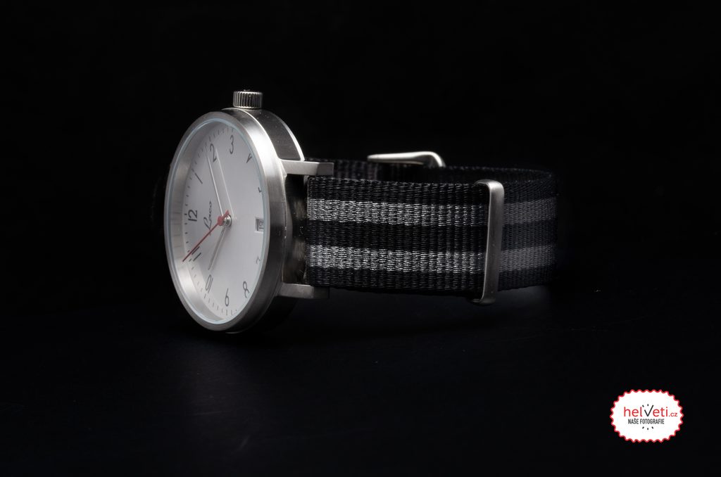 The white dial features a functional Bauhaus-style design. A minute scale is printed on its perimeter, complemented by black numerals at the hour positions. The timeless and clear dial is complemented by subtle silver hands and a contrasting red seconds hand. The watch features a date display at the 6 o'clock position. The dial is protected by mineral glass. The steel case of the watch is complemented by a textile NATO strap, finished with a signed thorn buckle. The water resistance of this watch is a sufficient 50 m (5 ATM) in this category. The diameter of the case is 38 mm, the length (lug-to-lug) is 45.6 mm, so the watch fits well on most men's, but also many women's wrists.