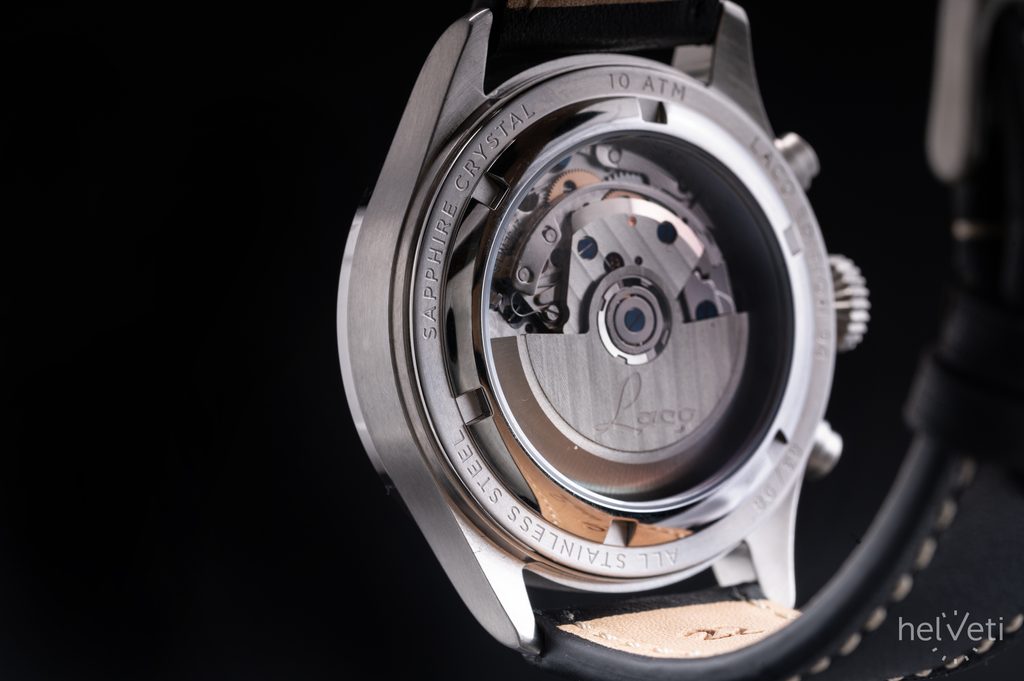 The steel case of the Laco Edition 98 is complemented by a black calfskin strap with contrasting light stitching and distinctive rivets. It is powered by a Laco 510 mechanical self-winding movement (based on the Sellita SW510BH b Elaboré - tested in 3 positions, accuracy +/- 10 s/day) with a power reserve of around 62 hours. The machine, with a frequency of 28,800 half-motions per hour, offers a stop-seconds function when setting the time(hacking) and a stopwatch with which up to 30-minute intervals can be measured. Both sub-dials (the minutes counter at 3 o'clock and the seconds counter at 9 o'clock) are luminescent and create an interesting spectacle in the dark. Many will be pleased to be able to observe the operation of the decorated movement with blue screws through the transparent caseback fitted with a sapphire crystal. The water resistance of this watch is 100 m ( 10 ATM), so it can handle swimming. The case diameter is 43 mm, the length (lug-to-lug) is 51.5 mm, so the watch fits well on most men's wrists.