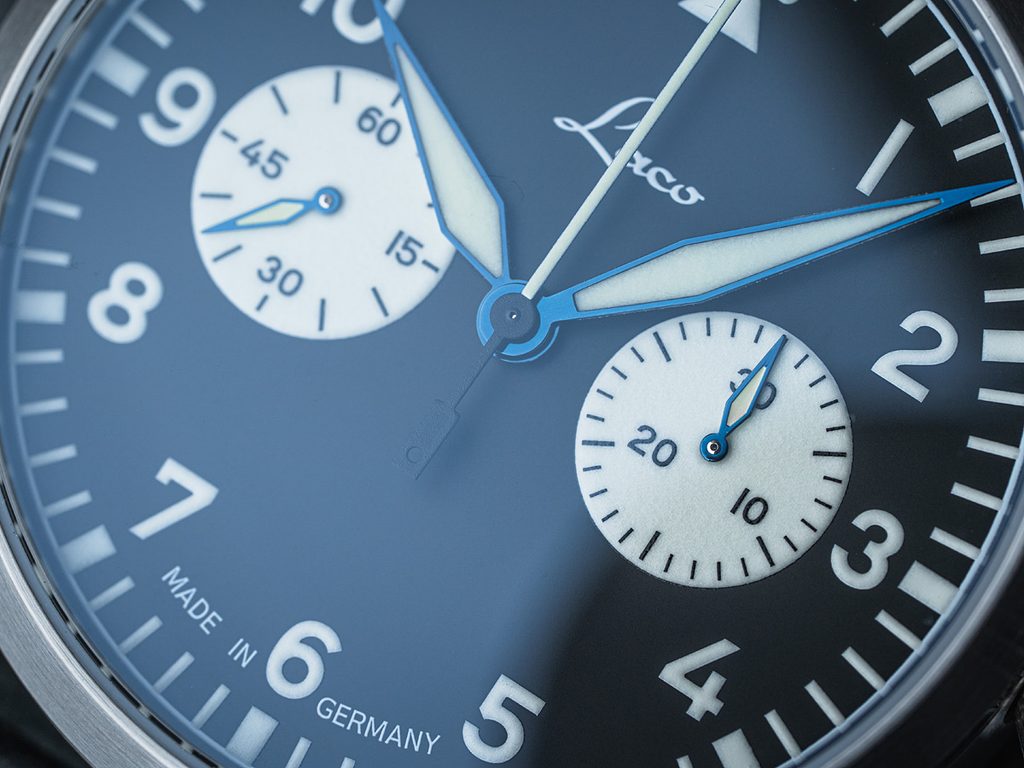 The classic hallmarks of the aviation-inspired Laco Edition 98 include the distinctive and easy-to-read thermal blue hands and indices at the hour positions, the distinctive diamond crown that is easy to operate even with gloves, the higher water resistance and the screw-down case. The perfectly clear dial is protected by a convex sapphire crystal with internal anti-reflective coating and high scratch resistance. Excellent legibility in low-light conditions is ensured by luminescence located on the hands, numerals, indices and also the sub-dials.