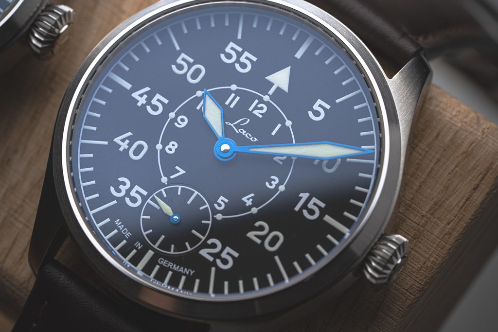 The classic hallmarks of the Laco Würzburg 42.5 pilot's watch include the distinctive and easy-to-read hands and indices at the hour positions, and the large crown, which is easy to operate even with gloves. The perfectly clear B-type dial is protected by a sapphire crystal with internal anti-reflective coating and high scratch resistance. The B-Uhr type B dial features a minute scale printed around the perimeter of the dial, with an arrow at the 12 o'clock position for quick orientation for aviators and an hour scale printed on the inner circle. The luminescence on the hands, numerals and indices provides better legibility in low light conditions. The hands of the watch are thermal blue.