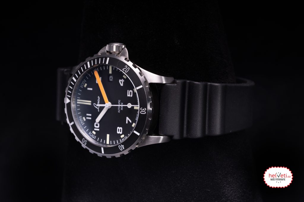 The Laco Himalaya 39 from the Squad series are characterised by their robust yet compact case and clear design. The steel case of the watch is complemented by a black rubber strap finished with a thorn buckle. The watch features a unidirectional rotating diving lunette with a ceramic insert with minute markers. The black dial features excellent clarity and legibility, which is enhanced in low-light conditions by luminescence on the hands and indices. It is protected by a convex sapphire crystal with internal anti-reflective coating, reducing glare and ensuring good readability in direct light.