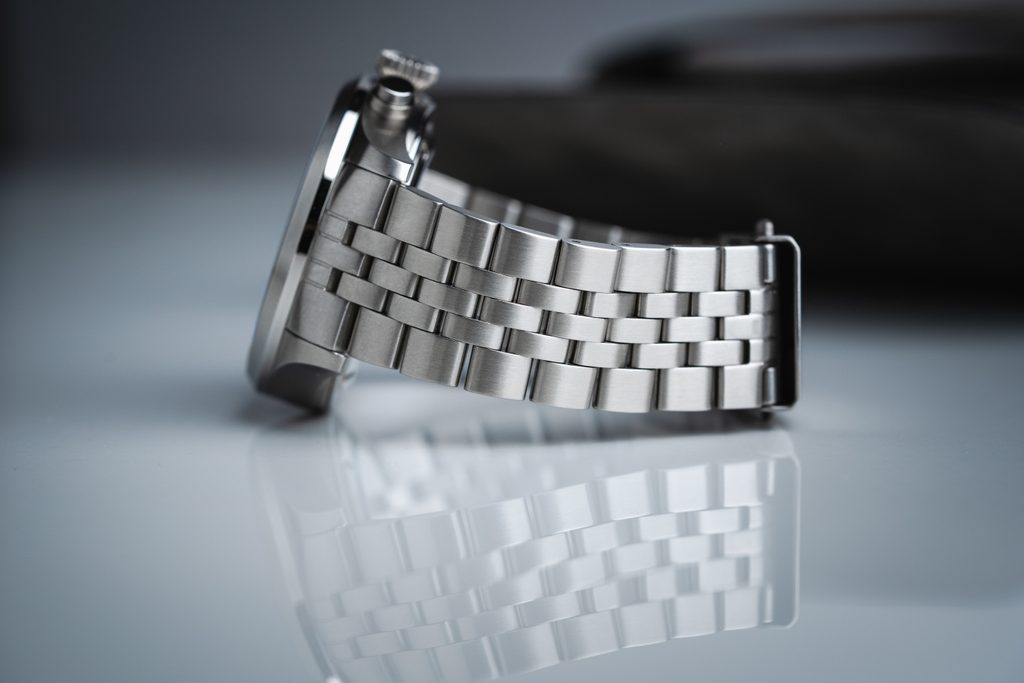 The Laco Kiel.2.MB Blau comes with a dark blue dial with a sunburst effect. The steel case of the watch is complemented by a five-row link bracelet finished with a fold-over clasp. The watch is powered by a Laco 500 mechanical self-winding movement (based on the Sellita SW500 Elaboré - tested in 3 positions, accuracy +/- 10 s/day) with a power reserve of around 56 hours. With a frequency of 28,800 semi-frequencies per hour, the machine offers a crown winding function, a stop-seconds function when setting the time(hacking), a date and day display (abbreviations of days in German) at the 3 o'clock position and a stopwatch with which up to 12-hour intervals can be measured. Many will be pleased to be able to observe the operation of the movement through a transparent dial fitted with a sapphire crystal.