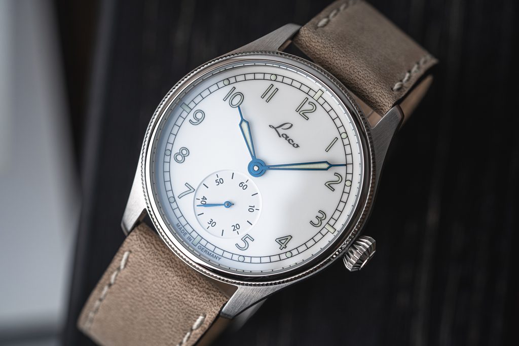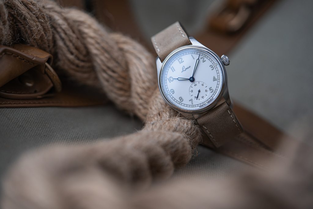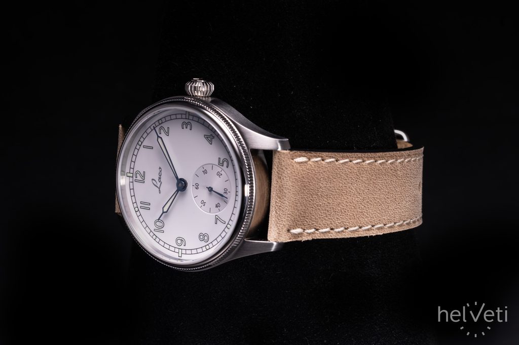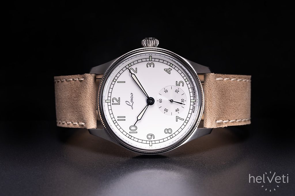 The watch is powered by a Laco 261 mechanical movement with manual winding (the basis of the Sellita SW261), offering a power reserve of around 38 hours. Better legibility in low light conditions is ensured by the luminescent filling of the numerals, hands and hour points. The white dial, reminiscent of enamel, is protected by a sapphire crystal with internal anti-reflective coating. The seconds hand is off-centre in the sub-dial at the 6 o'clock position. The timeless and clear dial is complemented by thermal blue hands. The watch case is made of stainless steel and is complemented by a light brown leather strap. An interesting element is the grooved lunette and the distinctive onion crown.