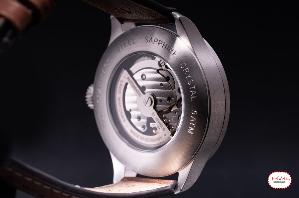 The watch is powered by a Laco 21 self-winding mechanical movement (based on Miyota 821A), offering a power reserve of around 42 hours, a stop-seconds function when setting the time(hacking) and the option of manual winding. A luminescent dial provides better legibility in low light conditions. It is protected by a sapphire crystal with high scratch resistance. The watch is equipped with a date display at the 6 o'clock position. The watch case is made of stainless steel and is complemented by a brown leather strap. Many will enjoy the possibility to observe the movement through the transparent dial fitted with a sapphire crystal. The water resistance of this watch is 50 m ( 5 ATM), so it can handle contact with water during hand washing and rain. The case diameter is 39 mm, the length (lug-to-lug) is 46.5 mm, so the watch fits well on most men's wrists.