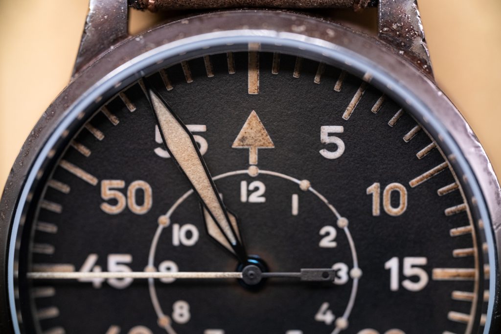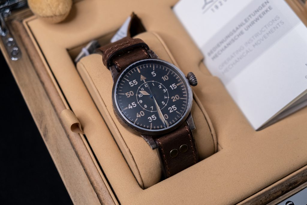 Inspired by the original observation watches from the 1940s, the models in the Laco Pilot Original collection have a case diameter of 55 mm and look as if they have been worn by several generations. The handmade watches of the Erbstück collection are unique in their appearance and manufacturing process. The traces of ageing give these watches a historical charm that can usually only be found on original models.