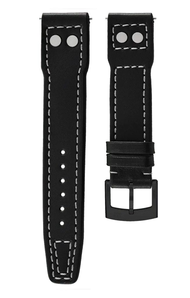 The black Biatec pilot-styleleather strap with a fine-grained texture and white stitching features high water and scratch resistance. It also boasts good flexibility, which guarantees high wearing comfort.