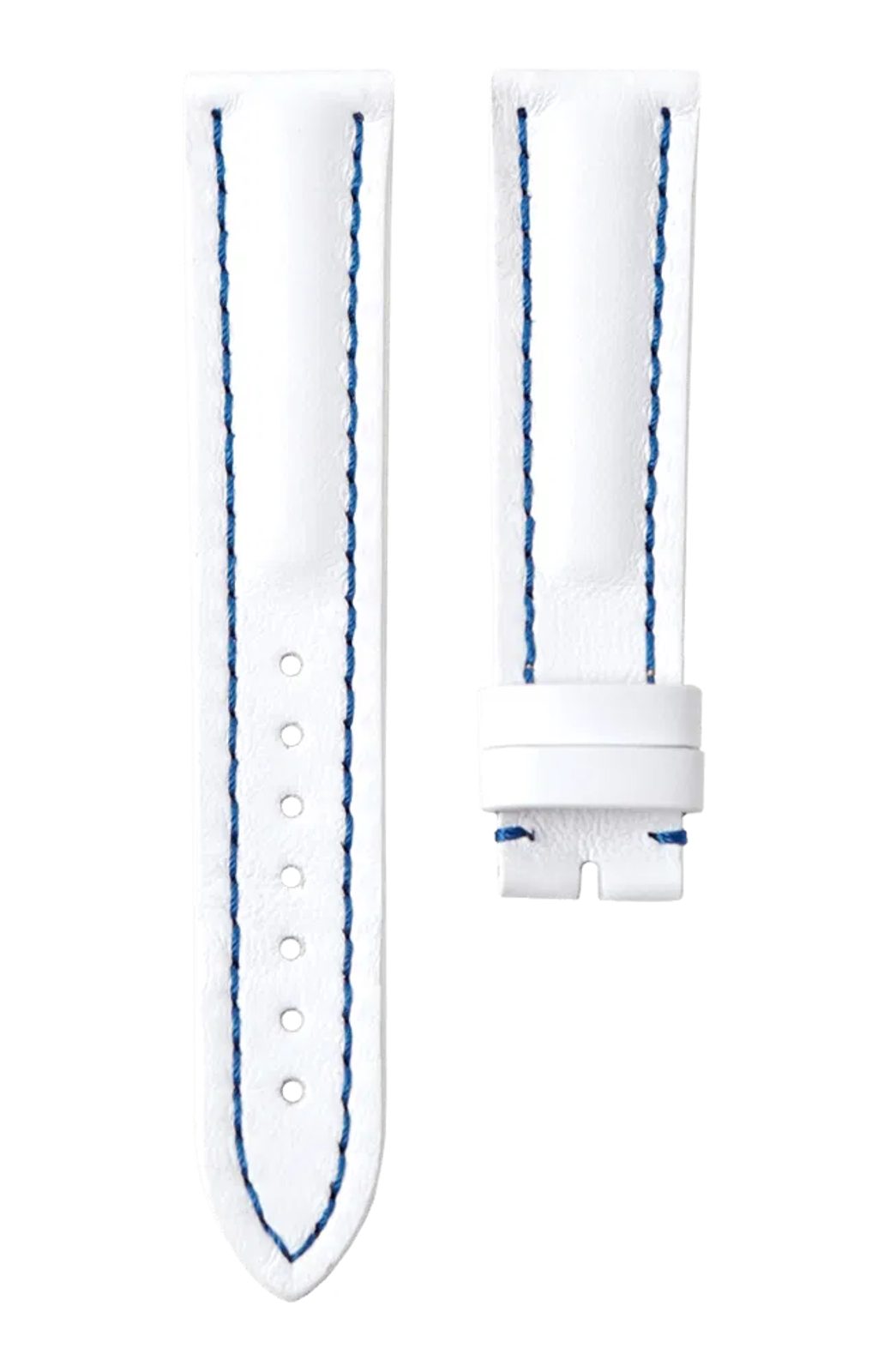 The white Biatec leather strap with a fine-grained texture and blue contrast stitching features high water and scratch resistance. It also boasts good flexibility, which guarantees high wearing comfort.