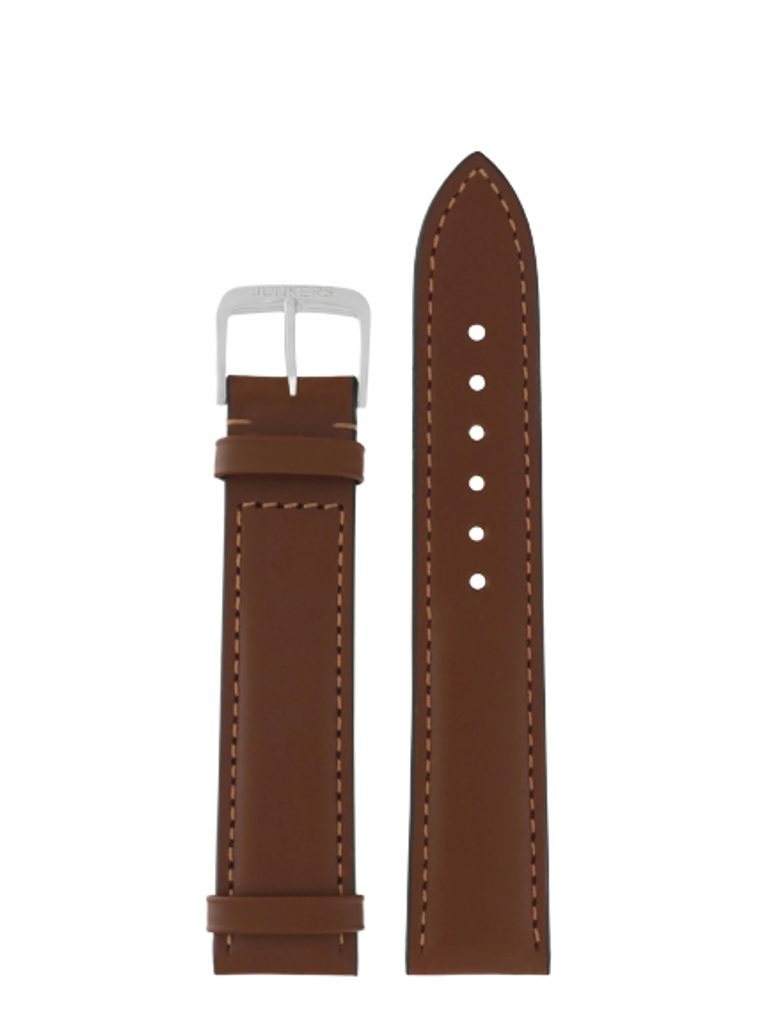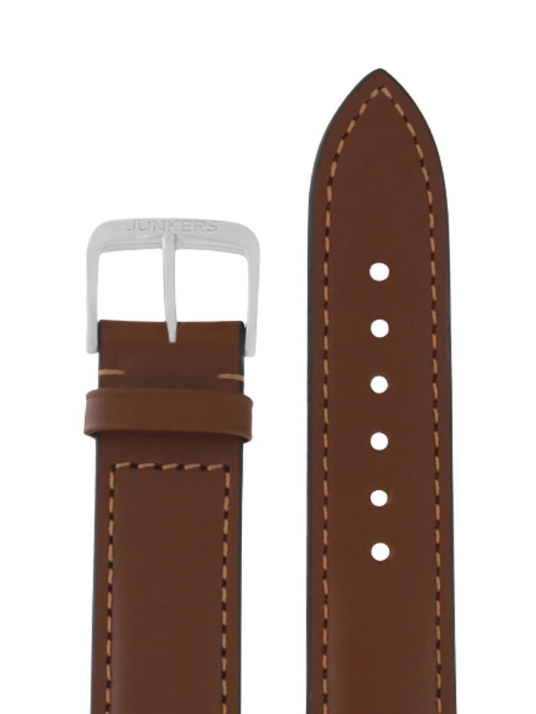 The original Junkers XL strap is brown in colour and 20 mm wide, made of calf leather. It is complemented by a thorn buckle and a colour-coordinated seam.