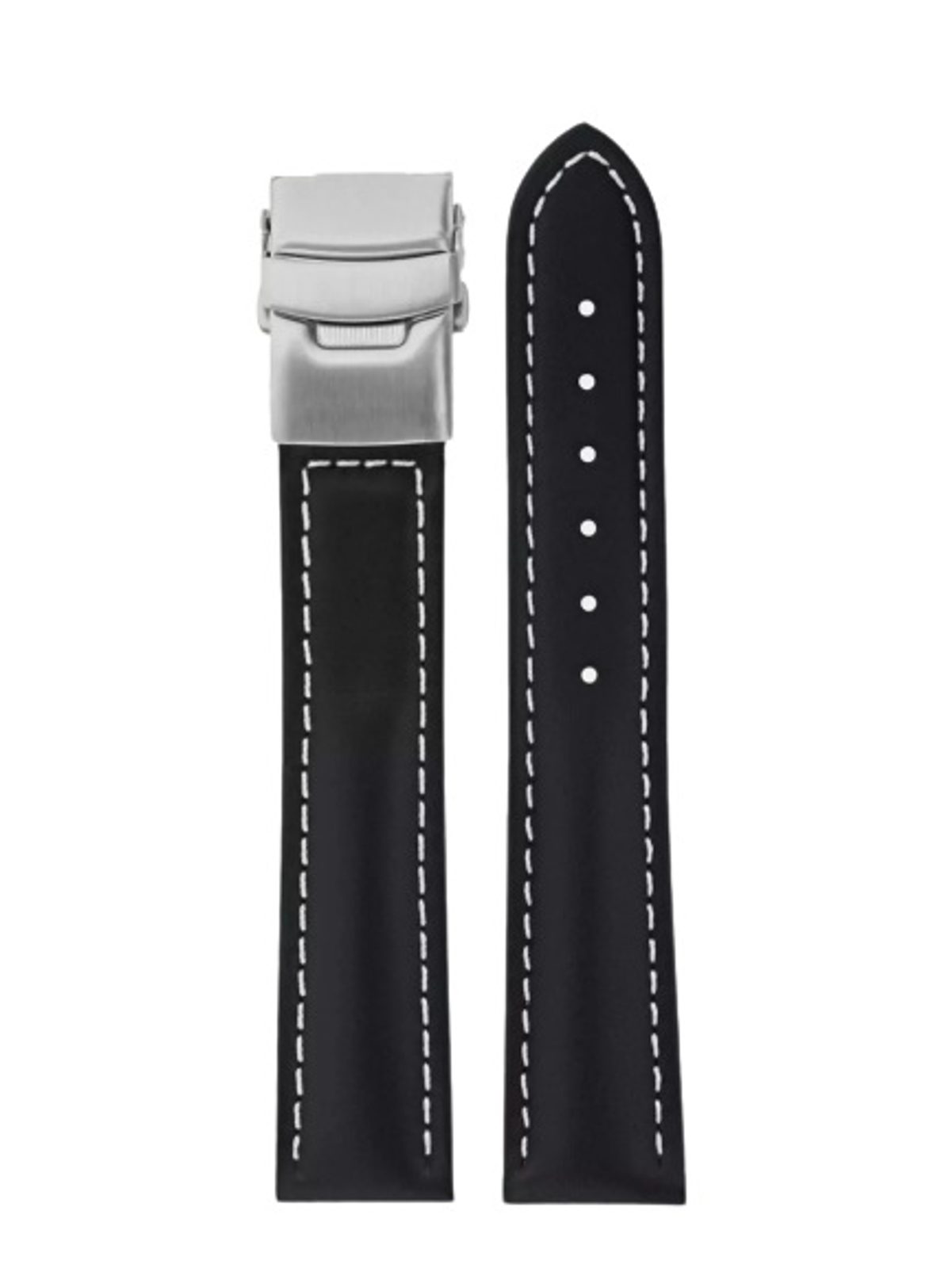 Original Junkers XL strap in black, 22 mm wide, with smooth surface, silver buckle and white stitching.