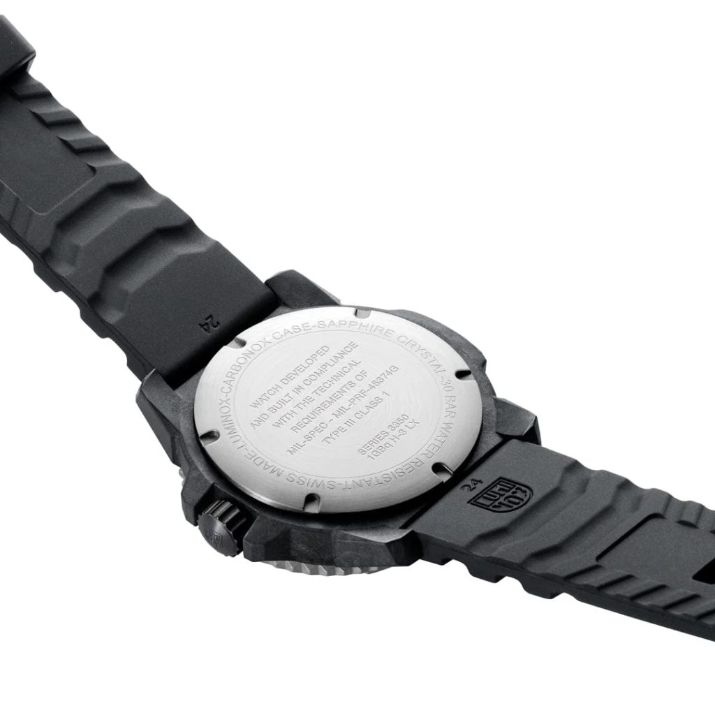 Among the important features we can also include the low weight of the model. The Luminox XL.3351.2 watch weighs only 90 grams thanks to its carbon case, combined with a silicone strap. The rubber strap and titanium lunette offer aesthetics and practicality. The large white seconds hand with SuperLumi-Nova coated arrowhead and Luminox Light Technology (LLT) ensure unrivalled visibility in all lighting conditions. The sapphire crystal with anti-reflective coating then ensures maximum resistance to scratches and glass breakage. Tritium capsules embedded on the hands and indices ensure legibility in the dark for up to 25 years.