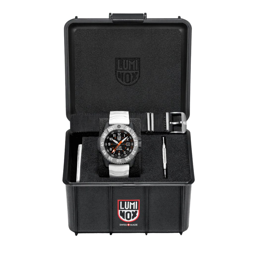 Among the important features we can also include the low weight of the model. Thanks to the carbon case, combined with a silicone strap, the Luminox XL.3359.SET watch weighs only 90 grams. The distinctive white strap and lunette design offer an Arctic aesthetic, while the large orange seconds hand with SuperLumi-Nova-coated arrowhead and Luminox Light Technology (LLT) ensure unrivalled visibility in all lighting conditions. The sapphire crystal with anti-reflective coating then ensures maximum resistance to scratches and glass breakage. Tritium capsules embedded on the hands and indices ensure legibility in the dark for up to 25 years.