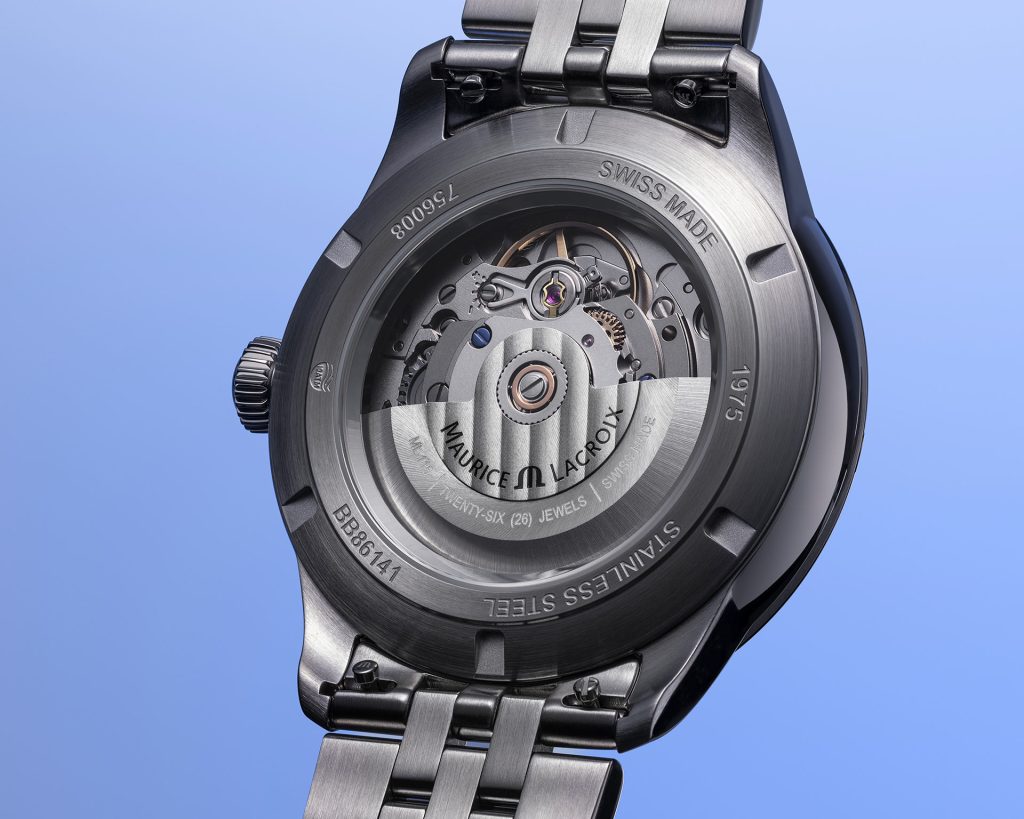 The Maurice Lacroix 1975 756008-SS002-430-1 watch has a case made of stainless steel, which is complemented by a bracelet made of the same material. Inside the case, the Swiss mechanical movement with automatic winding ML115 works reliably, whose operation can be observed through the transparent case back. It is based on the reliable Sellita SW200 movement, runs at a frequency of 28,800 semi-beats per hour and has 26 jewels. The winding reserve is the standard 38 hours. The automatic winding rotor is decorated with vertical Geneva stripes (Côtes de Genève). In addition to the date display, the machine also has a "hacking" function (stopping the seconds hand when ordered) and the possibility of manual winding by the crown.