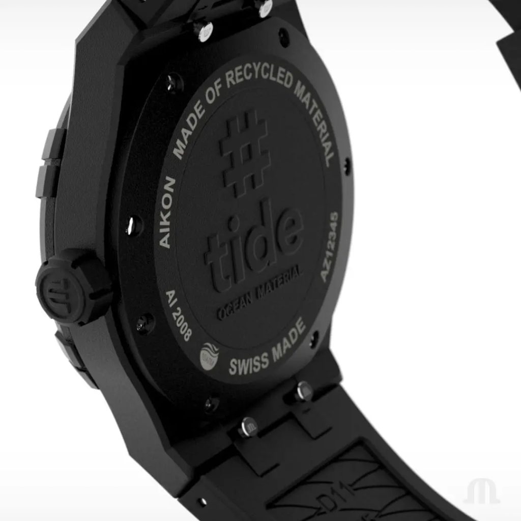The Maurice Lacroix Aikon #tide AI2008-00000-300-0 watch has a case made of composite material. This is upcycled plastic, combined with fiberglass, which is obtained from plastic waste in the oceans. The resulting composite material is twice as hard as standard plastic, five times more durable and has a significantly smaller carbon footprint. It takes 17 bottles to produce one watch model and its packaging, made up 100% of #tide ocean material®.