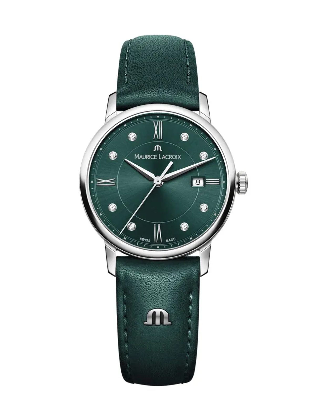 The Maurice Lacroix Aikon Ladies EL1094-SS001-650-5 watch has a case made of stainless steel, which is complemented by a green calfskin strap. Inside, a Swiss Ronda 585 battery-powered movement ticks reliably. The watch features a date display, which can be found at 3 o'clock.