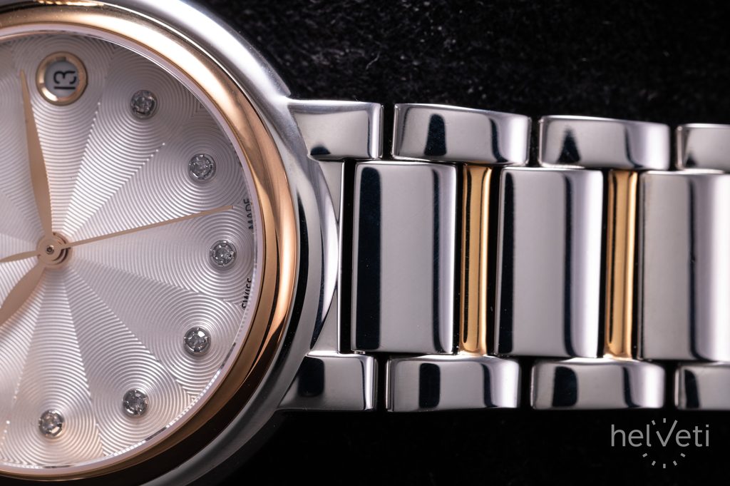 Thesilver guilloche dial with sunburst effect is protected by a sapphire crystal with anti-reflective coating, which is maximally scratch-resistant. There are 11 diamonds at the index positions and the elegance of the watch is enhanced by the gold-coloured hands. The water resistance of this model is 30m, it can handle only basic contact with water such as washing hands.