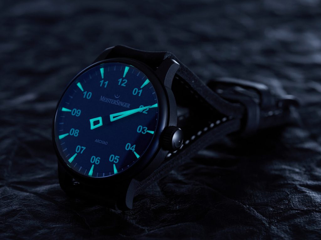 The main feature of the Archao Black is the blue dial with extremely distinctive applied hour indexes and double-digit numerals, which, like the massive hand, are marked with a distinctive luminescence. These absorb light during the day to release it after dark in the form of an intense, long-lasting brightness. The needle-shaped hand then intuitively indicates the time in typical MeisterSinger style - calmly, clearly and without haste. The whole looks balanced and modern with a touch of sportiness - like a watch that lives day and night.