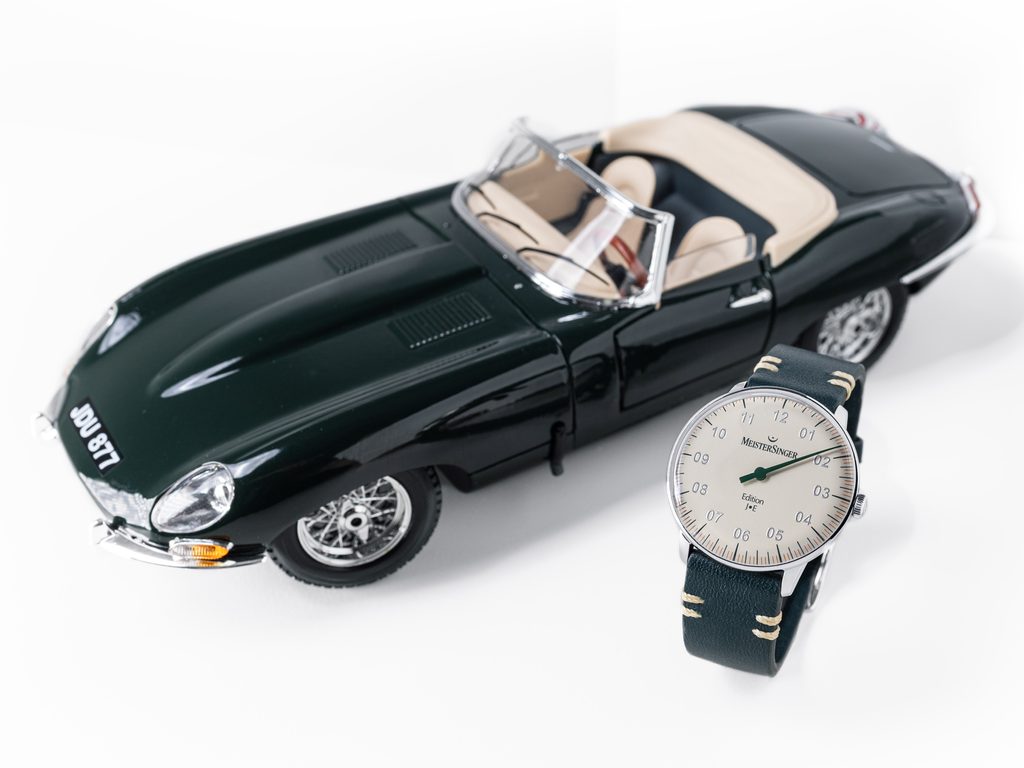 Inspired by the iconic Jaguar E-Type, the unique MeisterSinger Neo J.E special edition model combines the vintage-style MeisterSinger Neo with a green car model. The limited edition of just 100 pieces is a piece that everyone should want in their collection. The Neo J.E also comes in an exclusive collector's pack with a 1:18 scale model of the Jaguar E-Type Cabrio.